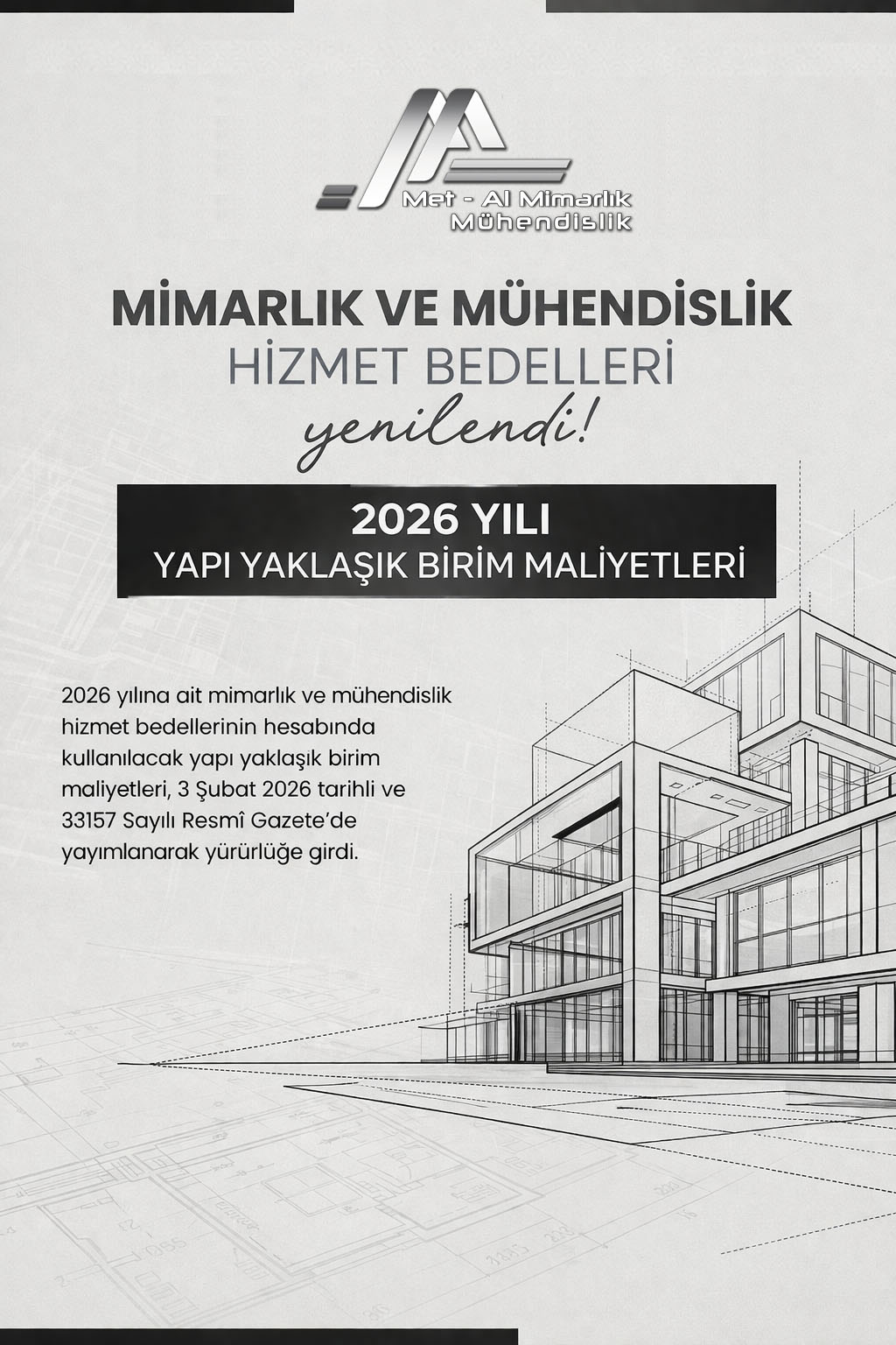 2026 yılı mimarlık ve mühendislik hizmet bedellerinin hesabında kullanılacak yapı yaklaşık birim maliyetleri, 3 Şubat 2026 Tarihli ve 33157 Sayılı Resmî Gazete’de yayımlandı.
